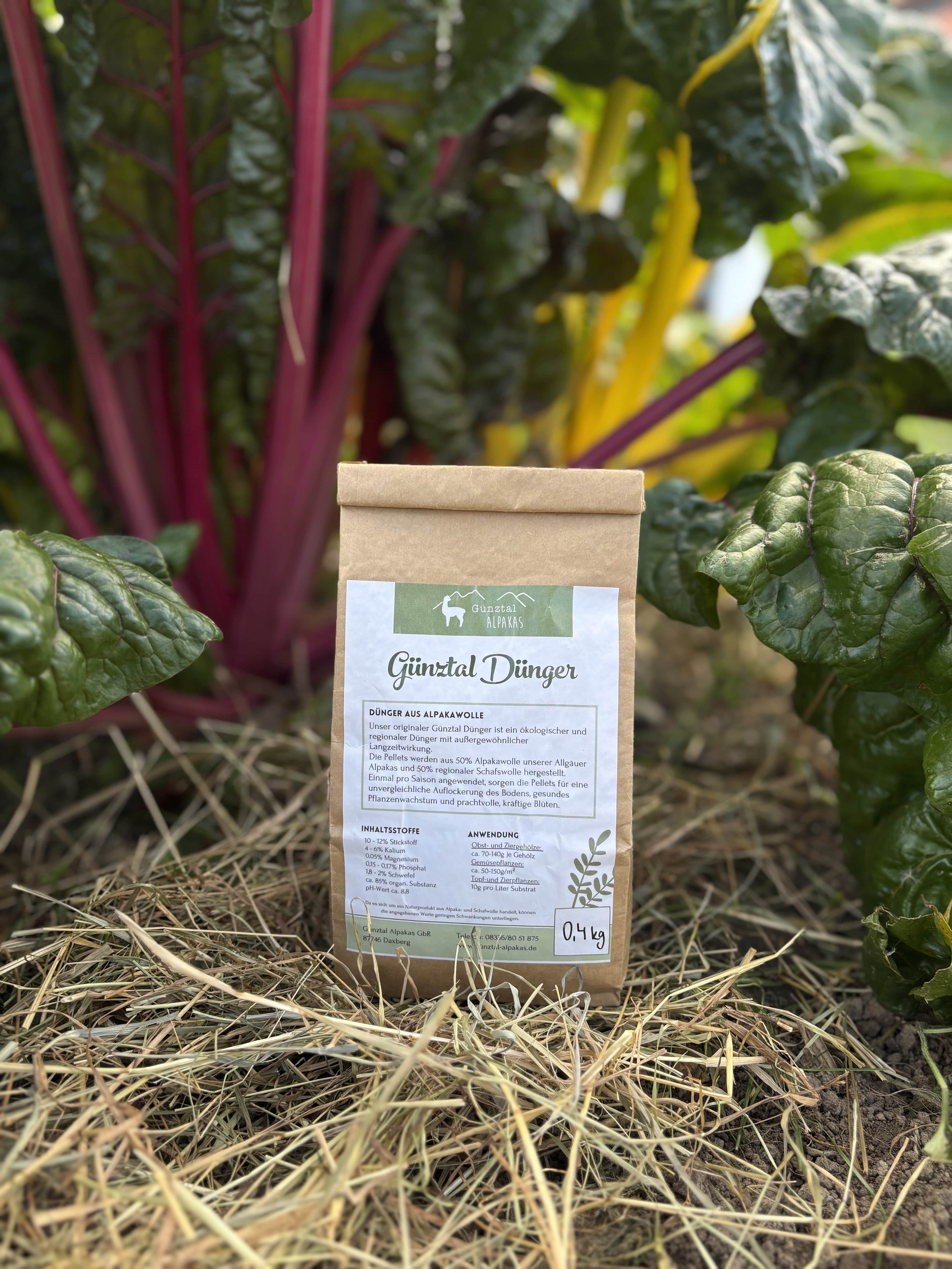 Unser originaler Günztal Dünger ist ein ökologischer und regionaler Dünger mit außergewöhnlicher Langzeitwirkung. Die Pellets werden aus 50% Alpakawolle unserer Allgäuer Alpakas und 50% regionaler Schafswolle hergestellt.