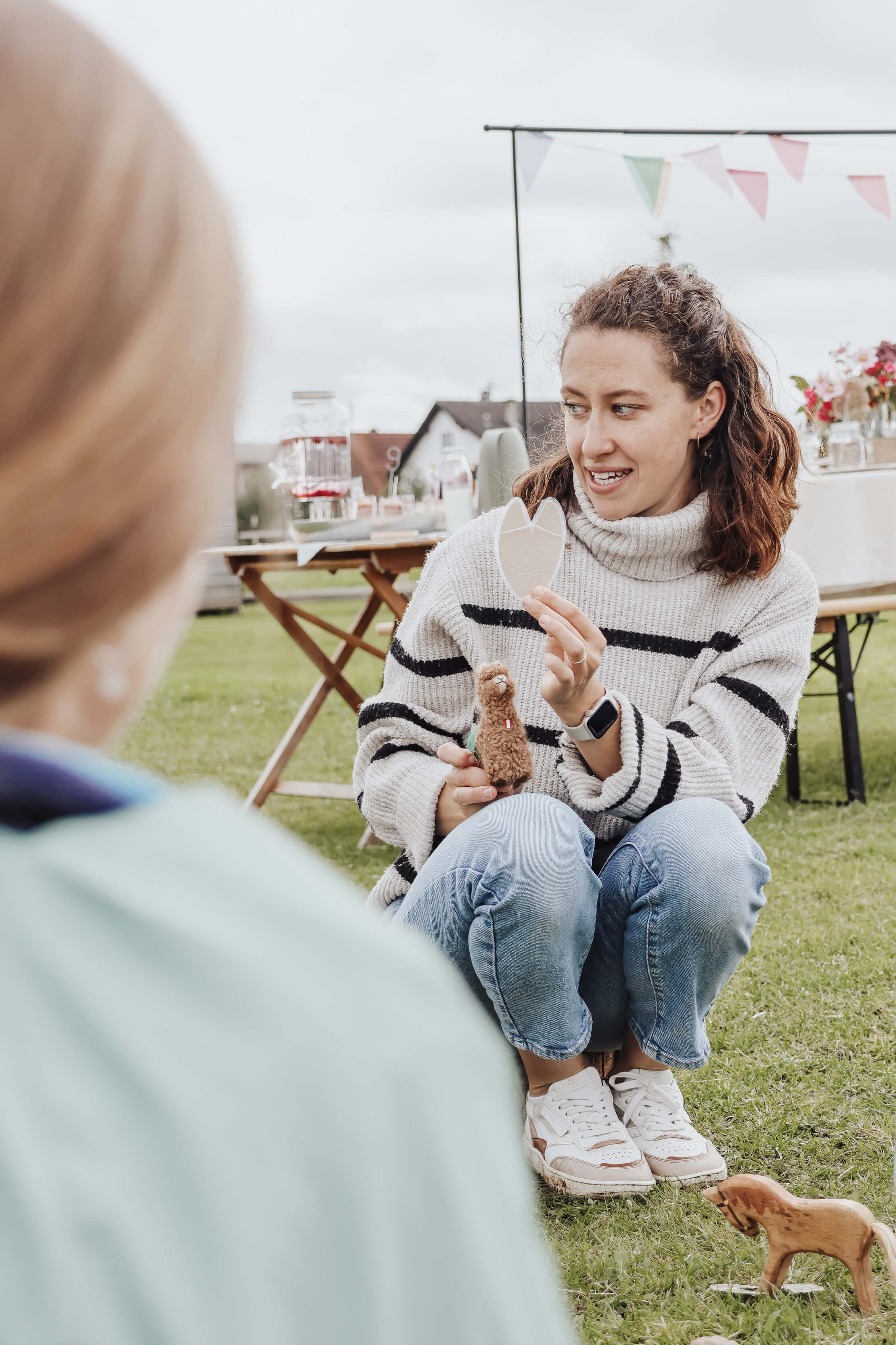 Für zwei Stunden wird unsere Alpakaweide zur Geburtstagslocation. Mit einem liebevoll gedeckten Tisch, Girlande am Stall, Getränken von Allgäuer Alpenwasser und vielem mehr.