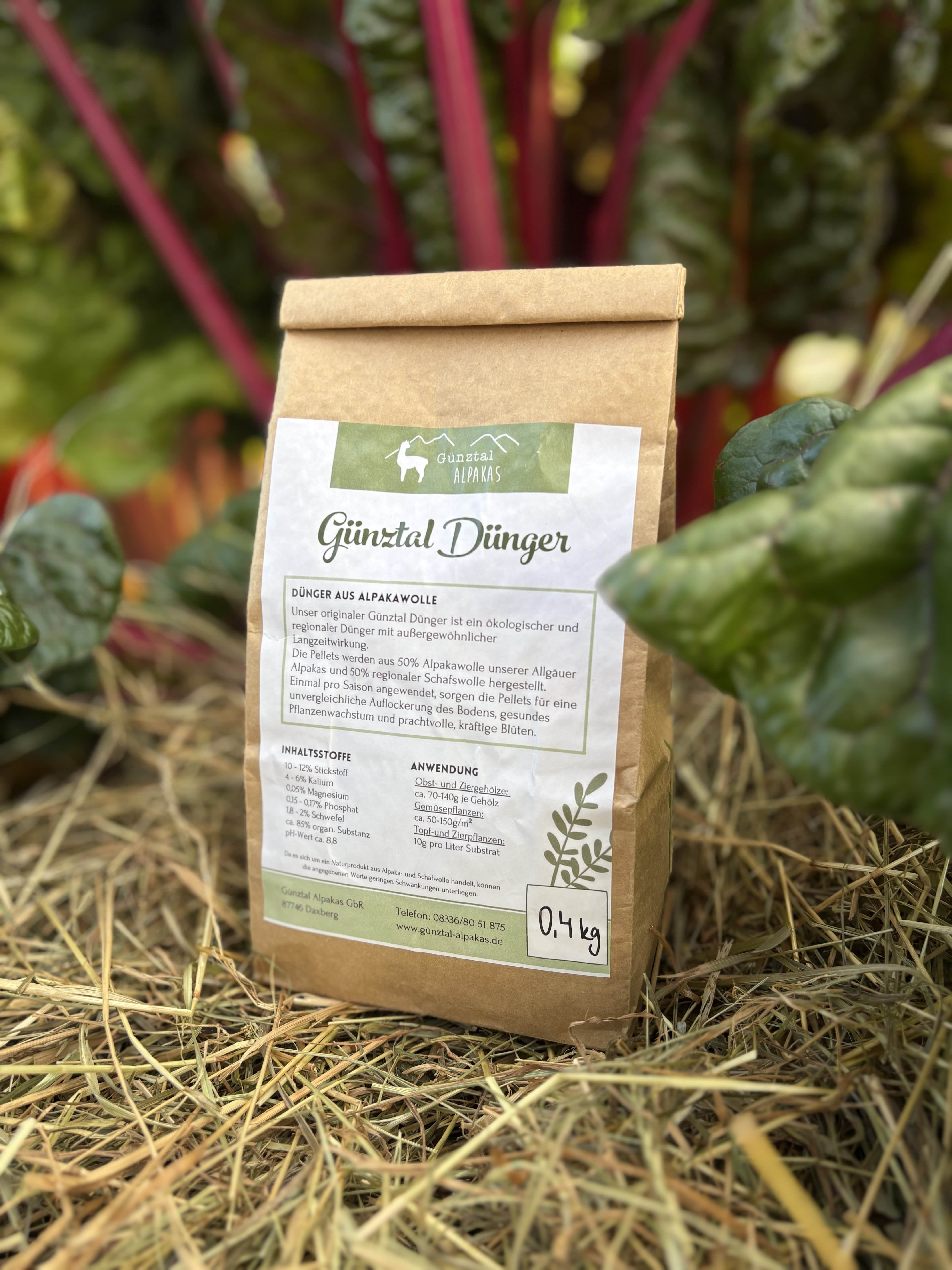 Unser originaler Günztal Dünger ist ein ökologischer und regionaler Dünger mit außergewöhnlicher Langzeitwirkung. Die Pellets werden aus 50% Alpakawolle unserer Allgäuer Alpakas und 50% regionaler Schafswolle hergestellt.